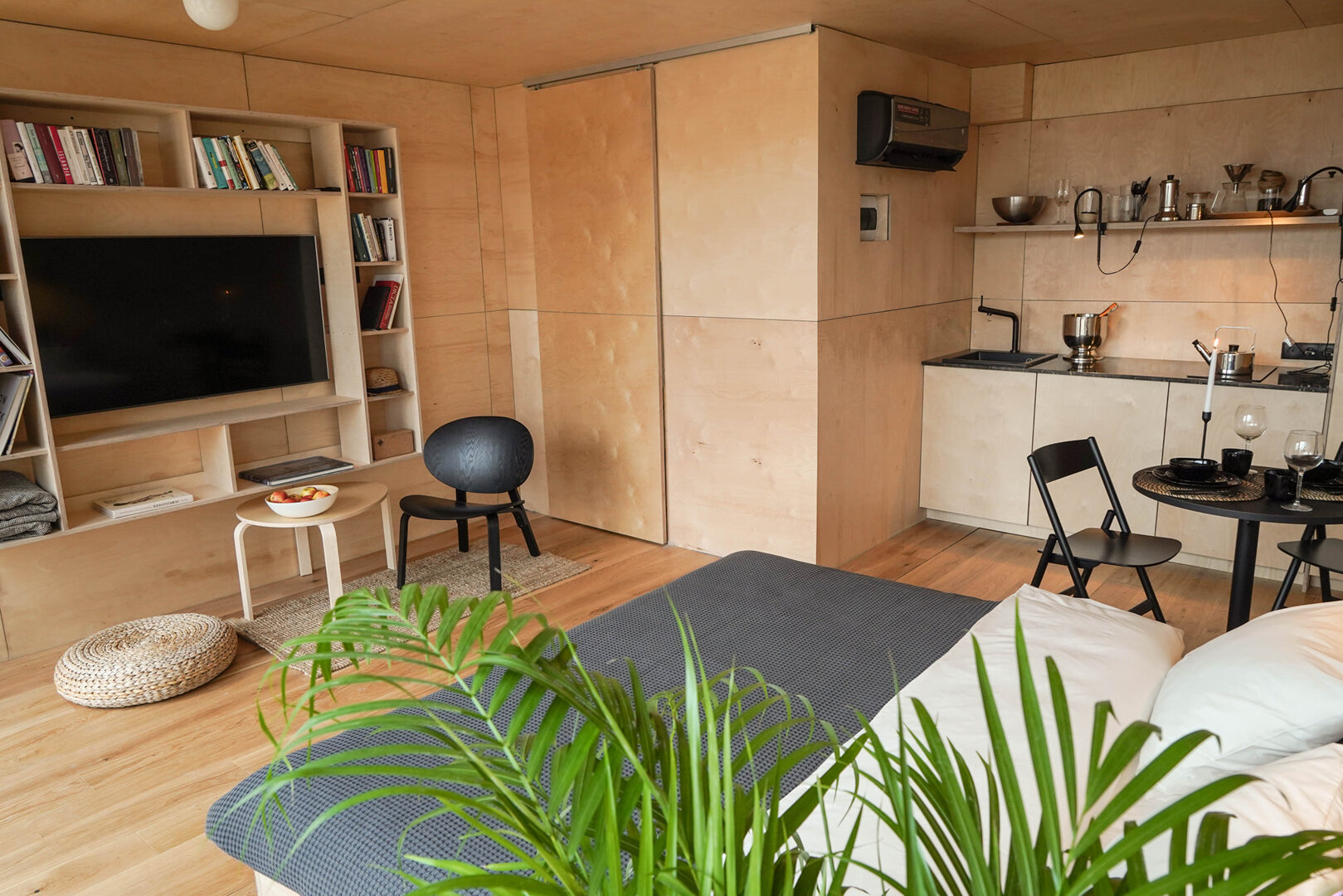 30 m² powierzchni domu obejmuje jedną otwartą przestrzeń mieszkalną, aneks kuchenny z płytą indukcyjną oraz łazienkę z prysznicem. Domki są całoroczne, wyposażone w klimatyzację i ogrzewanie, co zapewnia komfort niezależnie od pory roku. Do dyspozycji Gości są miejsca do siedzenia i hamaki rozmieszczone wśród zieleni.