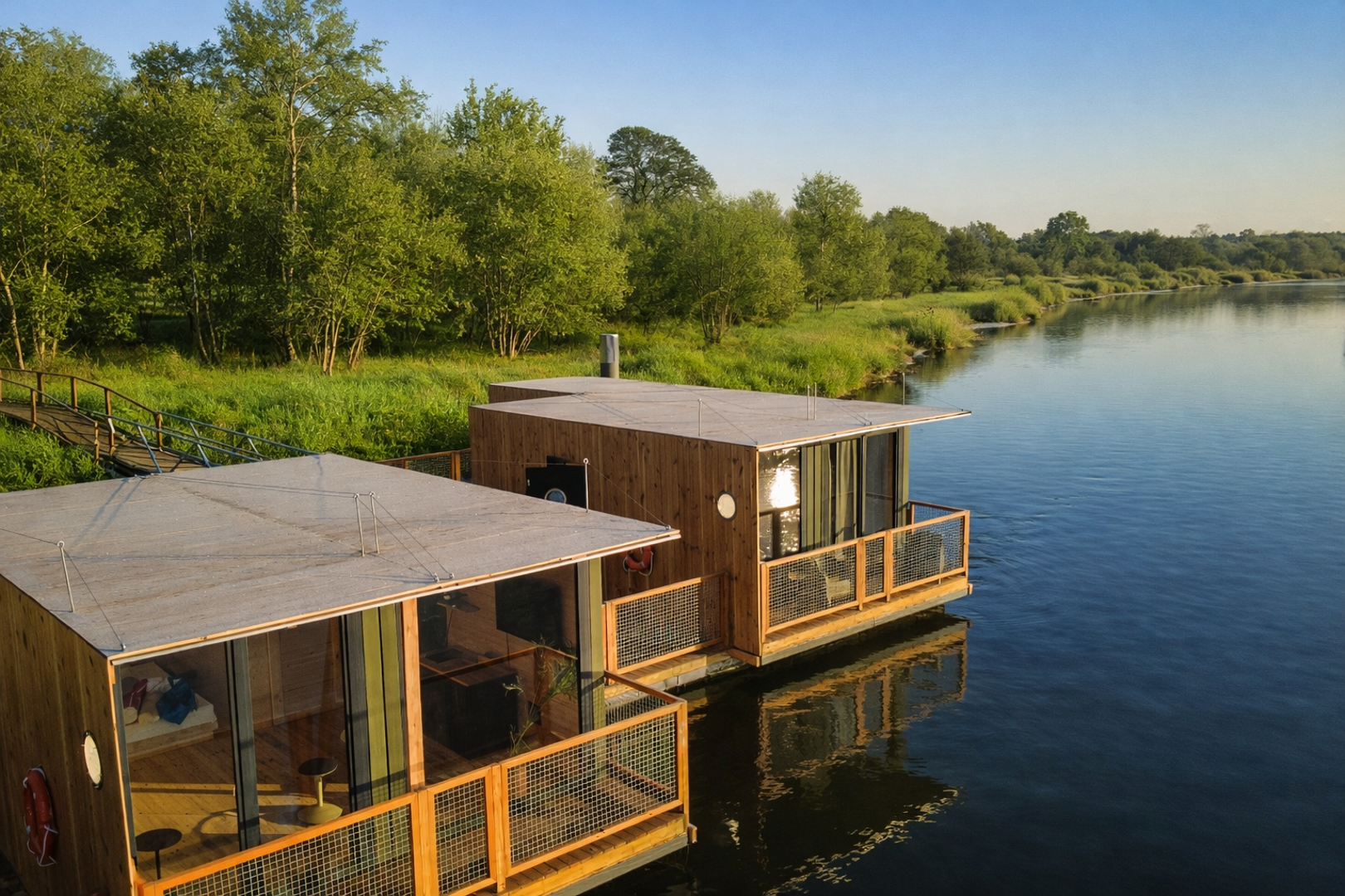 Na terenie znajduje się siedem nowoczesnych domków: cztery położone w ogrodzie, z widokiem na rzekę, oraz trzy unikatowe domki na wodzie, usytuowane bezpośrednio na tafli rzeki Warty. Domy na wodzie umożliwiają mieszkanie tuż nad nurtem - z prywatnym tarasem, z którego widać zmieniające się światło dnia, ruch wody oraz życie toczące się nad rzeką. To rzadko spotykana forma noclegu w mieście, oferująca ciszę i prywatność.