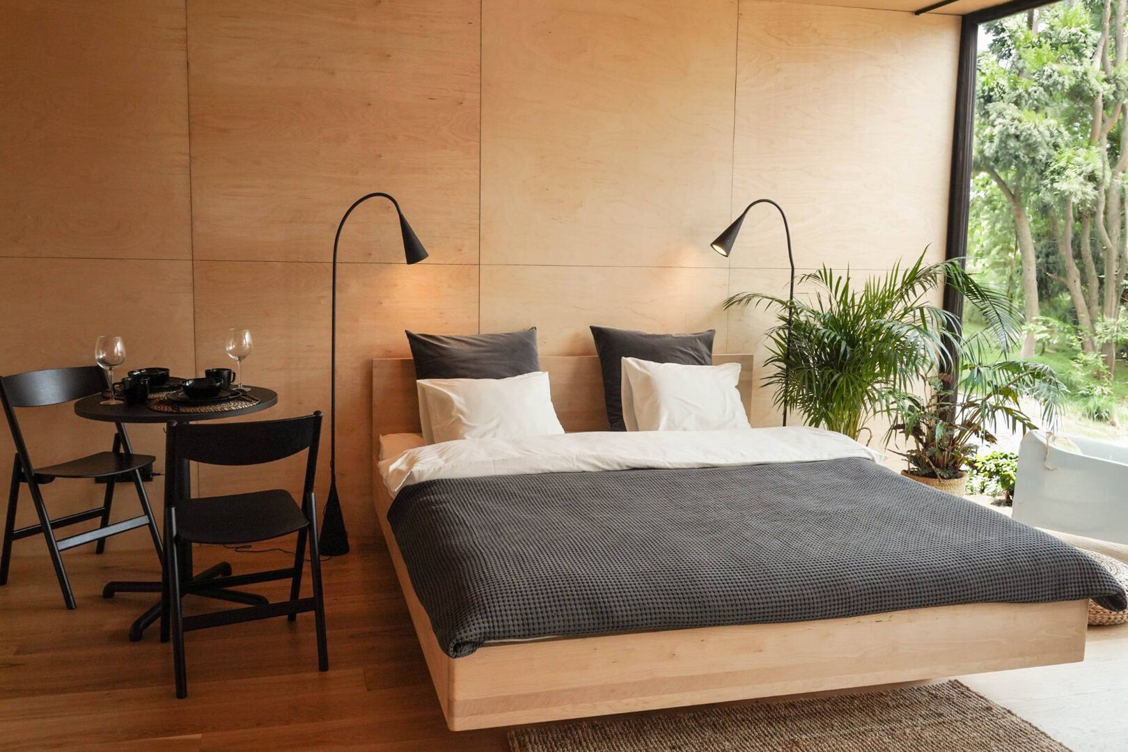 Cały kompleks zaprojektowany został w zrównoważonym stylu, z dużym naciskiem na naturalne materiały i prostą formę. Wnętrza domków wykończone są drewnem i utrzymane w stonowanej kolorystyce, co tworzy spokojne, neutralne tło do odpoczynku. Każdy domek posiada prywatny taras - w ogrodzie lub na wodzie - który stanowi integralną część przestrzeni mieszkalnej i pozwala spędzać czas na zewnątrz od rana do wieczora.