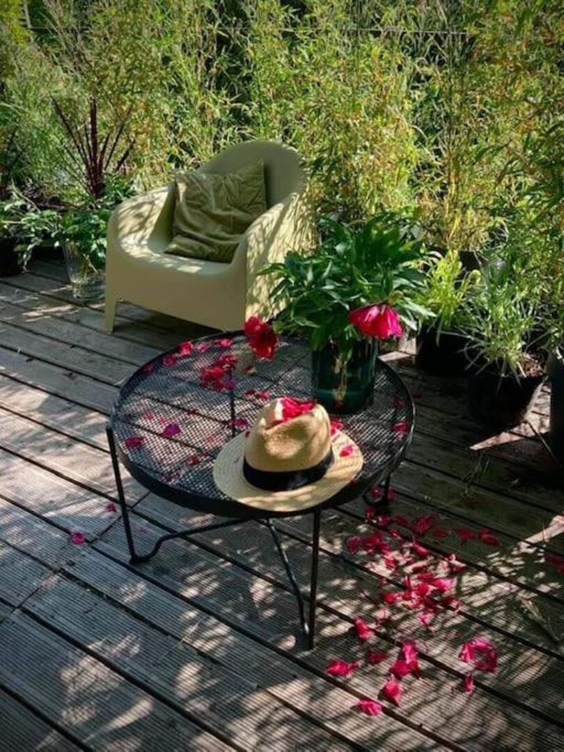 Domek w ogrodzie ma powierzchnię 30 m2, składa się z jednego pomieszczenia, aneksu kuchennego z płytą indukcyjną i łazienki z prysznicem. Klimatyzacja daje komfort latem i zimą. W domku na półkach stoi kolekcja albumów i książek.